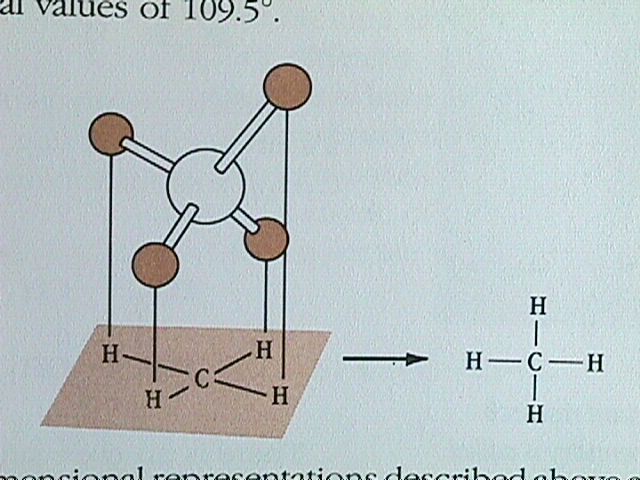 The ball and stick model is projected onto a 2D surface. The 2D representation makes the H C H angles appear to be 90 degree, although the bond angles have the tetrahedral values of 109.5 degrees.