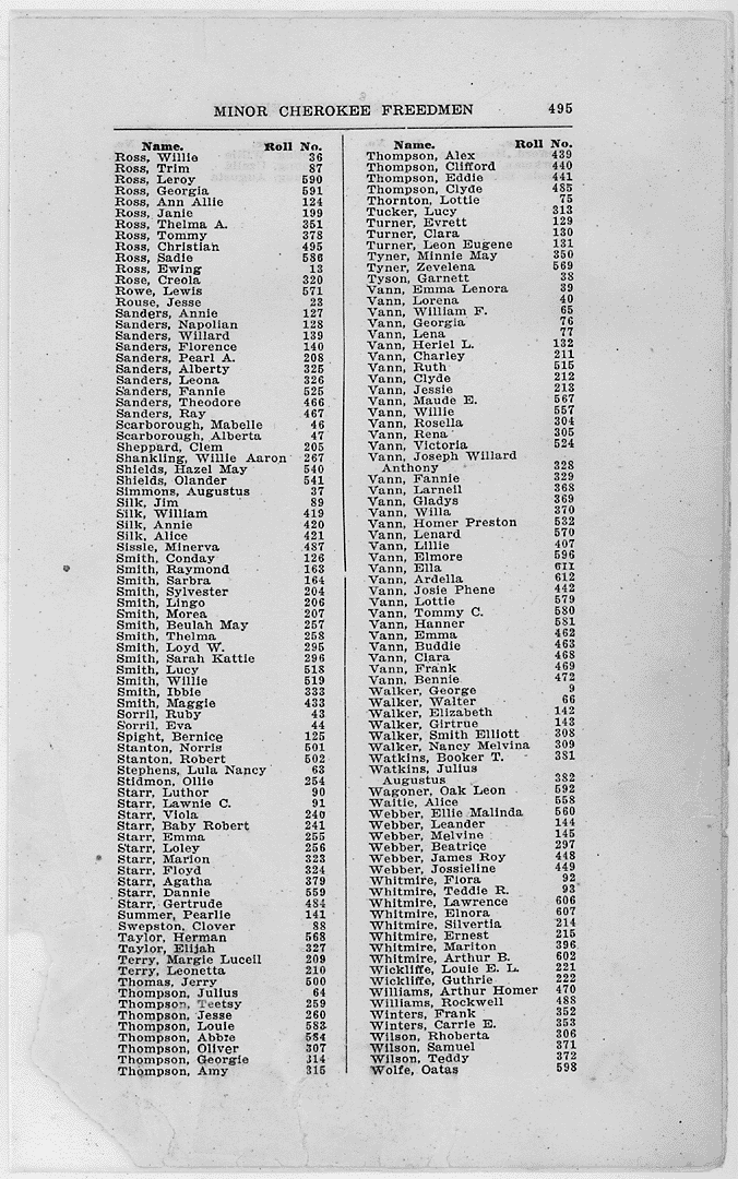 " General Note: This is the index to the names of individuals entitled to enrollment on the rolls of the various tribes comprising the Five Civilized Tribes in Indian Territory (Oklahoma). The index entries are arranged by tribe and thereunder by enrollment category (Cherokee By Blood, Cherokee Minor, Cherokee Freedmen, etc.). The entries for each enrollment category are arranged alphabetically by surname. (It should be noted that surname entries are not always in strict alphabetical order). Each index entry gives an enrollee's name and final roll number. After a person's enrollment category and final roll number have been determined, the final rolls can be searched to discover the enrollee's census card number. A copy of the census card can be obtained by writing the National Archives--Southwest Region, P.O. Box 6216, Fort Worth, TX 76115-0216. The cost is $10 per census card."