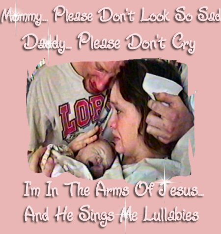 My husband and I suspected that I was pregnant because I had looked like I was starting to gain weight. So we went out and bought a pregnancy test. The test was negative. But I was also having some stomach pains, so I made an appointment with my doctor. When I went in she said that everything looked normal, and that I should take another pregnancy test just to make sure that thats not whats causing the discomfort. And I did. And just as soon as I walked in my house, the phone rang. It was the doctors office. They had called to congratulate us. I was pregnant. We were so so happy. But my doctor was still concered, and said that its not really normal to be having this much discomfort. She said she wanted me to have an ultrasound, to make sure my baby was not in my tubes. And so I did. I went in for a level two ultrasound. It contradicted what the doctor thought was wrong with me. But now they were telling me that I might have a molar pregnancy. And that I should probably terminate the pregnancy. That was not an option for me and my husband, so we went to see the doctor who delivered our first child. She did an ultrasound, and didn't say very much, except that, she wanted us to come back next week for another ultrasound. And we did. She said that things didn't look very good for us the week before, but now things were starting to look better. She had us come back every week for about a month or so. And each week things started looking better and better.(there was originally a couple unknown masses inside my womb around my baby. And each week they became smaller, and eventually disapeared.) She thinks that we had twins and that we miscarried one. Things went perfectly from there on, until we went in for our 19 week ultrasound. We went in to find out the sex of our baby. It was suppose to be a happy day, instead it was the day our world was turned upside down. The doctor said that things didn't look right. And that she wanted us to go see a specialist as soon as possible. She thought that the baby's head was bigger then her body for the gestation of the baby(could mean downsyndrome). And that my fluid level was extremely low. Well the specialist couldn't fit us in until the next night. So we had to go home not knowing what was wrong with our precious baby. And we had to wait a whole day, which seemed like forever, to find out what was wrong with her. When we went to see the specialist, things turned out to be worse then expected. The specialist said that there was NO fluid and NO kidneys(hence the reason for the lack of fluid((which developes the lungs, so this meant our baby would not be able to breath when she was born))). When we heard this me and my husband broke down. The specialist was very cold. He kept telling us, in a harsh, stern manner, "This is a poor prognosis, and termination is an option." Not for us we told him. God creates no accidents. We went home and told our family of the horrible news. They all, much like my husband and I, thought that their must be something that can be done to save our baby's life. In the following weeks, we deiced that we wanted to change doctors. We wanted to find a christian doctor with the same beliefs, one that wasn't trying to push abortion down our throats. And one that would do anything to help our baby. We prayed and prayed, and then my husbands aunt called us and told us of a doctor in our sister church(which we sometimes attended), who volunteered to help us through this pregnancy. We were so happy. God had answered our prayer. And we went to see him. He confirmed the diagnosis yet again. And told us that their really is nothing that can be done for babies with renal agenesis or potter's syndrome. In the following weeks I went on the internet searching and searching for a baby that has survived this syndrome that our baby had been diagnosed with. But I couldn't find one. We meet with neonatolgists(two of them) to talk over our options. We talked of lung and kidney transplants, which we found out were not possible in babies. So the only thing we were left with was the possiblitly of a miracle from God. We prayed and prayed for one all throught out the whole pregnancy. And we also prayed that if he didn't grant us one, that he would at least let her come into the world and stay a for while with us. I was having such a hard time decieding what to do. I knew in my mind that there was nothing that modern medicine could do to save her. But i felt like such a horrible mother saying, well just put her in my arms and let her die. How could I not try? The doctors and my husband kept reasuring me that there was nothing that could be done. And anything that would be done would just prolong her suffereing. I still wast not sure though. A wonderful couple at our church, gave our names and number to a couple whom had recently lost a baby to a chromosome abnormality. By talking to her, I realized what i had to do. I didn't want to cause my baby any more pain. It would just be selffish of me to do anything, knowning that nothing would work. Hearing her story, helped us out so much. I thank God for them everyday, because without them we wouldn't have gotten to spend as much time with our precious baby girl, as we did. The one thing that always sticks out in my mind is when she told what her husband would always say to her when she was carrying their son "There's only this much(he would take his two fingers and put them about an inch apart) that separates him from us." And that made us realize that, Yes, she is with us now, just because she is inside of me, doesn't mean that we can't spend time and make memories with her now. Every night before we'd go to bed my husband would get down by my belly and talk to her. He would tell her of his day. And she would actually(no kidding) move to the side he was talking to. It seemed like she wanted to be closer to him. It was so sweet. He'd also pray and read the bible to her. She was so active during this time, which wa