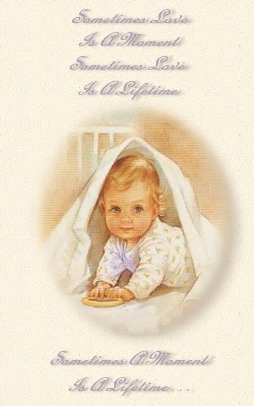 | Little Angels When God calls little children to dwell with Him above, We mortals sometimes question the wisdom of His love. For no heartache compares with, the death of one small child. Who does so much to make our world, seem so wonderful and mild. Perhaps God tires of calling, the aged to his fold, So he picks a rosebud, before it can grow old. God knows how much we need them, and so He only a takes few. To make the Land of Heaven, more beautiful to view. Believing this is difficult, still somehow we must try. The saddest word mankind knows, will always be "Goodbye". So when a little child departs, we who are left behind, Must realize God loves children, and that *Angels are hard to find* |