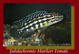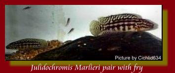 I just love this fish, the color and pattern of it is just great. The picture shows one of my two breeding pair and some of there fry. This pair spawns about every 8 weeks and I get about 75 fry per spawn. This is a very aggressive fish when spawning so it best to keep it in a breeding tank. I have had them spawn in the community tank and some of my other fish paid the price. This Julie is sometimes called the "Checkered board Julie" This is a cave spanner so rocks are a must if you want to breed. The pic. above shows the rock that they have dug under and that's where they spawn. The male Julidochromis that I have the are smaller than the females. However the males color is brighter and he tends to protect the area the female protects just the spawning site. I got these very nice Julidochromis from The Cichlid Exchange in Portland OR. (see links page).
