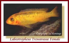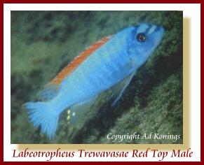 This is a very nice and colorful fish to have. Trewavasae's make great community fish and it is easy to tell the males from the females. Females are this OB color (OB = Orange Blotch) pattern and the males are a bright blue with a red Top or Dorsal fin, hence the name Red Top. This fish is a mouth brooder and I have had many batches of fry. This fish will produce around 20 fry per batch and you can tell males from females at birth. The juvenile males are a dark color with stripes when born. When they get to about 2" or so they will start to change color. With most Cichlids, breeding brings out the best color, so it's always a good idea to have both males and females. My Trewavasae's started breeding at about 2.5" to 3" long. I kept 2 males and 4 females, this also helps keep the males very nicely colored when they have a rival in the tank.
