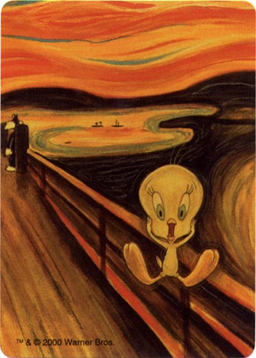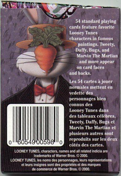 Received: Christmas 2001. I got this deck from "Santa Claus" for Christmas 2001. It's a really clever deck that takes Looney Tunes characters like Bugs Bunny and Daffy Duck and inserts them in famous paintings. I may eventually scan in all the different pieces of artwork but for now I simply have the box, the "Wild Card" and a couple of pieces of nice card artwork. Click on an image to enlarge.