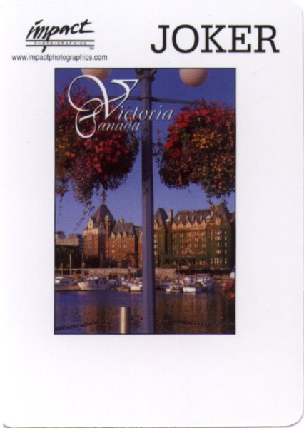 Part of the a double-deck including the Butchart Gardens cards. I got this double deck from my parents when they came home from vacation this year. Writing "Victoria Canada" seems a bit redundant to me, since I live in Canada, but that's beside the piont...The Victoria deck features a lovely picture of flowers in front of...perhaps the legislature? A neat building, anyway! Also, you can't really tell from the scans, but the writing on the Victoria side of the card box is embossed in gold. Swanky! Click on an image to enlarge.