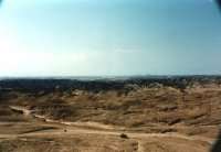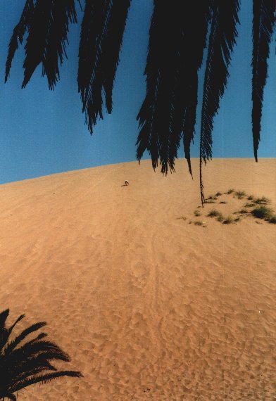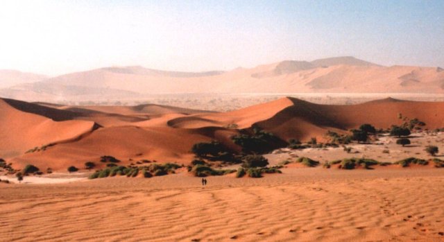 Na die 5 km kom je aan de Sossusvlei (foto links). Met zijn 450 meter is deze duin de hoogste van de wereld. Je kan er rustig op wandelen en genieten van het prachtig uitzicht (foto rechts). Deze duinen hebben de toeristen al wel gevonden en staan op het lijstje van de georganiseerde reizen.
