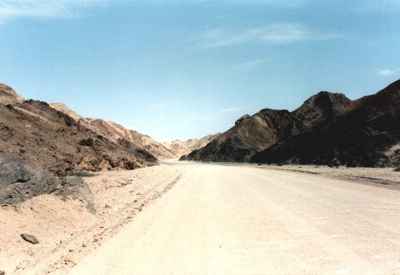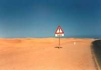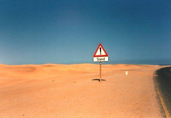 Zo'n 50 km ten zuiden van Swakopmund belanden we in Walvisbaai (Walvis Bay). Wie van Swakopmund naar Walvisbaai rijdt, langs de kust, zal verschillende keren het bord zien: 'pas op zand' (zie foto). Want de sterke kustwind blaast het zand op de weg, hetgeen slipgevaar kan veroorzaken. Walvisbaai is een vrij moderne stad met een wegennetwerk in een dambordpatroon. Tot op een paar jaar geleden was Walvisbaai nog grondgebied van Zuid-Afrika. Hierdoor bleef deze havenstad uit handen van de Duitsers. Aan de kust van Walvisbaai zijn er zeer veel flamingo's, omdat het water hier zeer ondiep is.