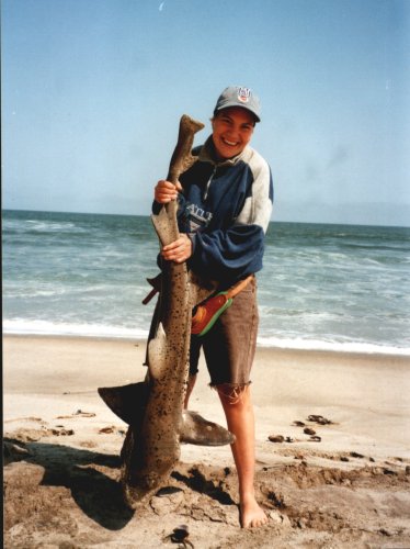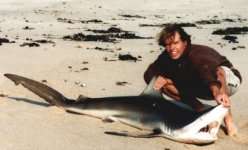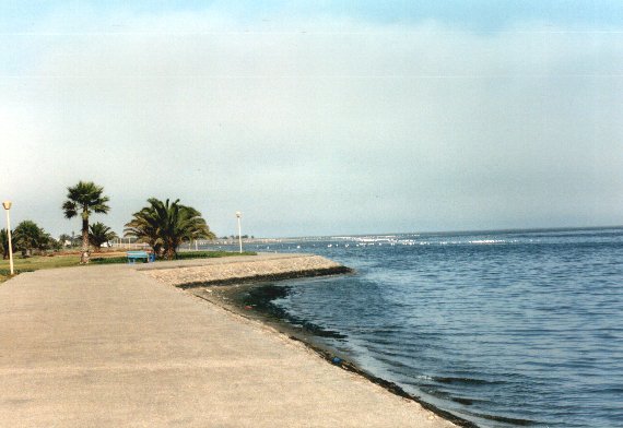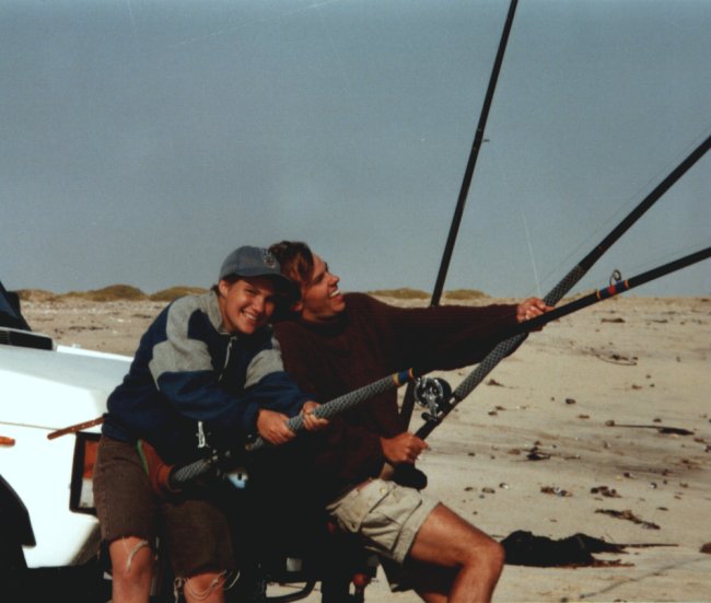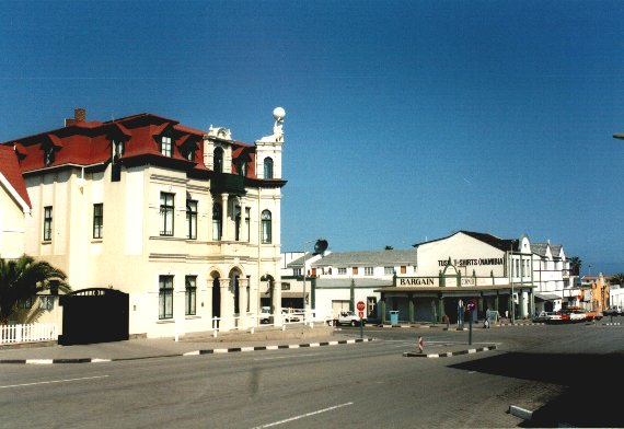 Tussen de zuidelijke Atlantische oceaan en de Namibwoestijn is Swakopmund. Een oude Europese stad, die stamt uit de tijd van de Duitse kolonialisten. De naam Swakopmund komt van de rivier de Swakop die hier in zee uitmondt. Dit Duits karakter valt nu nog sterk op, vele mensen spreken nog Duits en de straatnamen zijn ook in het Duits. Door dit typisch Duits karakter zijn hier natuurlijk veel Duitse toeristen. Wat ze ook van de Duitsers hebben overgenomen is de invoer van zomer- en winteruur, dus in de winter (rond juli) is het 1 uur later dan in Zuid-Afrika. Ook voor wie van Botswana naar Namibië reist moet zijn uurwerk 1 uur achteruut draaien, zo voorkom je verrassingen (zie reisverhaal maand). In Namibië kun je gewoon in Zuid-Afrikaanse Rand betalen. In Swakopmund kun je aan Shark Fishing (haaienvangen) doen. Als je tijd hebt is dit zeker de moeite waard. Je kunt vissen vanaf de kust (zoals wij doen op deze foto) of je kunt met een bootje de zee ingaan. Let wel dat het zeer zwaar is, want als je niet veel weegt is de kans groot dat de haai meer weegt dan jij. Een haai van 70 tot 90 kg aan de haak slaan is geen uitzondering, maar dan moet je hem nog op het strand krijgen. Tegenover zo'n zware haai moet je veel kracht zetten, want anders trekt de haai u voort over het strand. Na het vangen van de haaien slepen we, zoals echte natuurliefhebbers, de haaien terug de zee in.