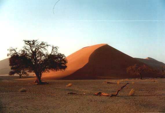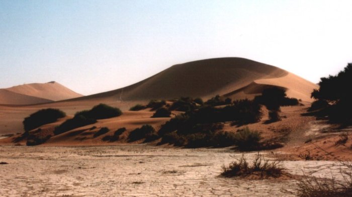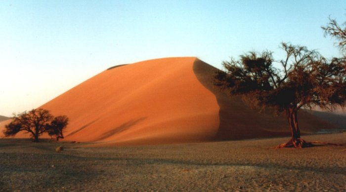 De duinen van de Namib Desert zijn een van de oudste in de wereld. Men vindt ze in de Sesriem Canyon tussen de Orange en de Kruiseb rivieren. Er is aan het begin van deze 'zandzee' een camping: 45 km van deze camping bevindt zich Dune 45 (3 foto's hierboven). De beste tijd om duinen te fotograferen, om die rode gloed te bekomen, is bij zonsopkomst of zonsondergang. De openingsuren van dit duinenreservaat zijn vóór zonsopgang. Wie dan vertrekt kan de zon zien opkomen vanaf Dune 45.