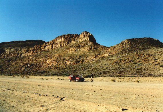 We verlaten de Sesriem Canyon om naar de Fish River Canyon te vertrekken. De verlaten zandweg brengt ons langs de mooie rotsformaties van het Nanania plateau.