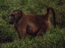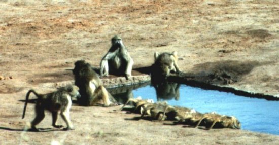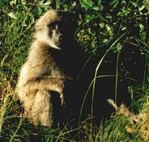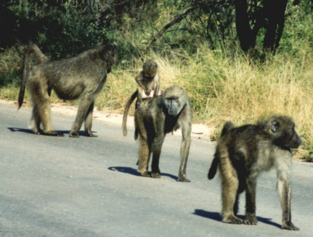 Een opvallend kenmerk is hun sikkelstaart (zie foto 4) het eerste deel van de staart staat naar boven en de rest hangt af. Hun kleur kan variëren naargelang de streek waarin ze voorkomen: van grijzig dof geel, verschillende schakeringen van bruin en donker grijs tot bijna zwart bij oude mannetjes.Wild Parken (Game Reserves)Bavianen vormen troepen van ongeveer 70 dieren met een duidelijke hiërarchie. De vrouwtjes dragen de baby's onder de buik en als de kleintjes ouder zijn worden deze op de rug gedragen (zie foto 1)