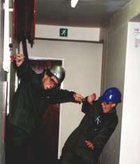 Totdat er water uit de brandweerslang komt. Gelukkig hebben we onze veiligheidskleren aan.