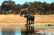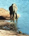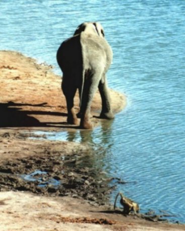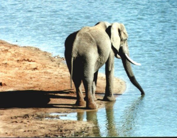 Het grote verschil tussen de Afrikaanse en de Indische olifant is dat de oren van de Afrikaanse olifant veel groter zijn dan zijn Indische soortgenoot. Zijn vel is grijs van kleur en is kaal behalve voor de haren op het puntje van zijn staart. De olifant heeft een lange slurf om voedsel en water in zijn mond te brengen. Als het warm is zuigt hij water op in zijn slurf en spuit het water over hem ter afkoeling.Wild Parken (Game Reserves)De olifant is een kuddedier en leeft samen met 6 tot 200 soortgenoten. Een olifant drinkt niet graag samen met andere dieren maar er zijn uitzonderingen zoals op foto 1, waar er achter de rug van olifant een klein aapje meedrinkt. De olifant ziet en hoort slecht maar kan goed ruiken. Het zijn ook goede zwemmers en zijn altijd te vinden voor een goed modderbad.
