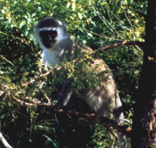 Het vervet aapje is een klein aapje met een lange staart. Hij heeft een zwart gezicht met daarrond een kring van witte haren. De rug en kop hebben een lichtgrijze vacht terwijl de buik en borst een nog lichtere kleur hebben. De poten en de punt van hun staart zijn donkerbruin. De Afrikaanse naam blouaap komt van het feit dat de geslachtsdelen van de mannetjes helderblauw zijn.Wild Parken (Game Reserves)Hij leeft in troepen van z'n 20 dieren. 's Nachts slaapt hij in bomen. Zijn voedsel bestaat uit vruchten, bladeren, zaden en insecten. Als vijanden kent hij de luipaard, de leeuw, en de kroonarend.