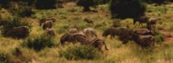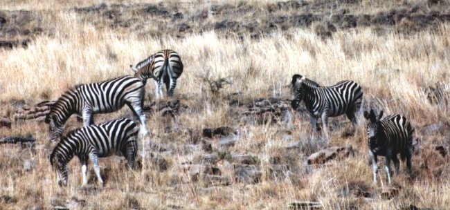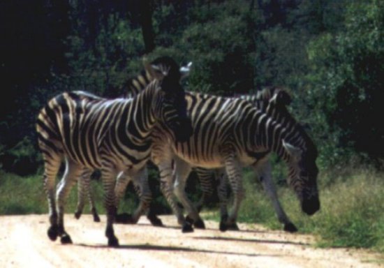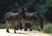 De zebra lijkt op een wit paard met zwarte strepen die onder de buik door lopen. Bij andere soorten zebra's (kaapse bergzebra en de Hartmanns zebra) is de buik volledig wit. Het patroon van de strepen verschilt van dier tot dier en dient als herkenningsmiddel. Op het achterlijf bevinden zich licht bruine schaduw strepen.Wild Parken (Game Reserves)Hij leeft in groepen van 4 tot 15 dieren en is dikwijls te zien samen met de blauwe gnoe (wildebeest). Zijn zintuigen zijn goed ontwikkeld. Hij eet voornamelijk gras maar soms ook bladeren. Als vijanden heeft hij de gevlekte hyena, de leeuw en de jachtluipaard (cheeta). Het geluid dat hij voortbrengt is een herhaaldelijk "kwa-ha-ha" gehinnik als gevolg van een fluitachtige inzuiging van lucht.