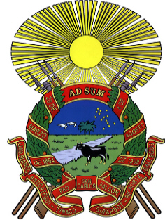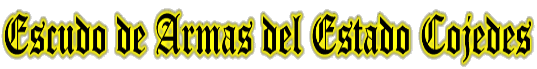 The Cojedenian Coat of Arms, created by Decree of the Regional Executive on January 1st, 1910, consists on a circular seal with a simple field enameled on azure (blue) where appears a semblance of the predominant landscape in the region. On the fine carpet of the llanos (the Venezuelan plains) groups of palms and diverse trees stand out on intervals for reveal the fecundity of the Cojedenian ground. Crossing on counterbend (from the sinister to the dexter of the shield) its shows an undulant silver tape that represents a navigable river for where the force that impels the trade of the federal entity circulates. There, a magnificent black bull with the horns and hooves in gold, stands out on its foot for dominates with their look the immensity of the llanos, to symbolize the prosperity of the cattle raising: main source of the wealth of the Cojedes State. On direction to the upper dexter canton and over the horizon, two white herons lift the flight in the face of the first radiances of the dawn, while on the upper sinister canton it stands out the constellation of Orion which dominates the Venezuelan and Cojedenian sky great part of the year, to represent the heroes of this land that contributed with their courage and with their blood to forge the destiny of Venezuela. As external ornaments, the shield presents a resplendent sun like a cimier, symbol of Glory, which illuminates the Latin war voice AD SUM (I am Present) as timmer, that represents the attitude of the Cojedenians in front of the history: ready and sign to spill its blood Iike yesterday to defend the causes of the Right and of the Freedom. The laurel crown that surrounds the field as a border and the war trophies, four lances and two rifles with soaked bayonets crosses on saltire behind the shield, symbolizes the victories that the Cojedenians reached in the fight for the national emancipation. The scarlet pennants that wrap the crown and hold it under the shield, presents like mottoes the ephemeris 28 de Marzo de 1864 (March 28th, 1864), date when the Federal Constitution of Venezuela was sanctioned and 4 de Agosto de 1909 (August 4th, 1909), date of the creation of the State and also, the names of the municipalities that integrate it LIMA BLANCO, ANZOATEGUI, TINACO, PAO, SAN CARLOS, FALCON, GIRARDOT, RICAURTE and ROMULO GALLEGOS.