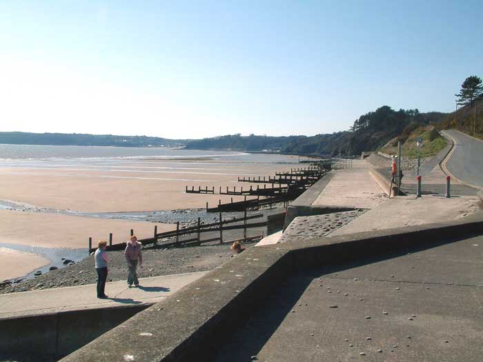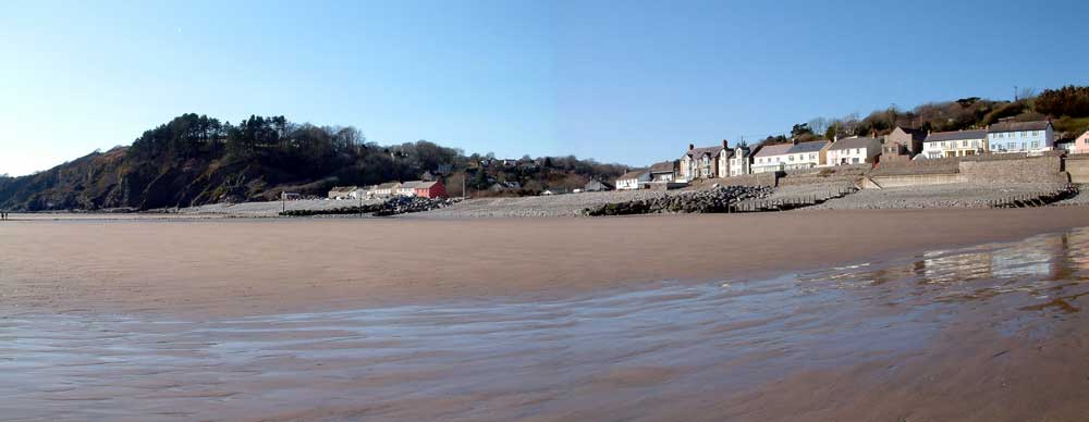 West of Pendine is the small village of Amroth. The beach is a vast expanse of sand with a rocky headland at each end. At a very low tide the stumps of a fossilized forest can be seen.The only problem I found was to walk along the beach, involved crossing the small streams that run down from the shoreline, as you can see in the photo below. Not a problem if you take off your shoes and socks! Otherwise a great beach, safe for bathing, and some rock pools for the kids. There are a few shops and eating places and a pub, access for the disabled is good and there are good clean toilets near the shops. There is a car park although it can be a problem in busy periods. Dogs are not allowed on the main part of the beach between May and October. |