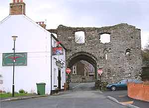 | The town of Kidwelly still retains the pattern of a Medieval walled town, and although the walls have long gone, the remains of the 14th century South gate (above) still stands on the main street. ( note nice little pub to the left). |