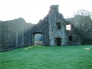 The most outstanding feature of the castle is the complete Norman door way (pictured left) It dates from the 12th century and it is quite ornate on the outside although plain on the inside. Passing through the doorway brings you into a circular courtyard.The curtain wall now in ruins, still stands to its full height on the west side.Built into the curtain walls on the south and west side are two towers,the south tower is still well preserved. Apart from refurbishments in the south tower in the 16th century, the castle is untouched since the 12th century.