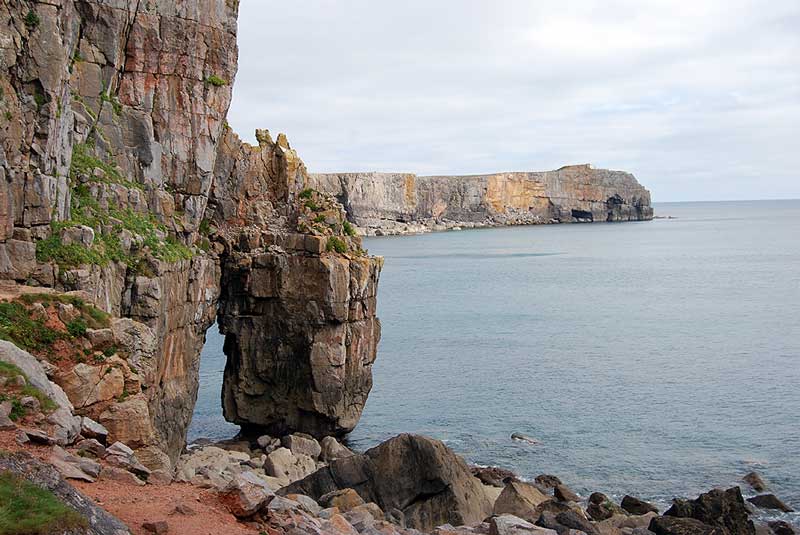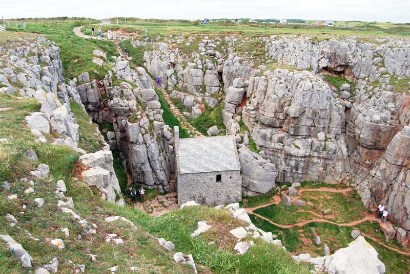 Not too far from Tenby, on the spectacular St Govans head, wedged into a tiny crevice in the cliffs you will find St Govans chapel. This tiny chapel was built in the 13th century on the site of the cell of a 6th century Celtic monk. The hermit St Govan, an abbot from Wexford, Ireland reportedly hid from his pagan persecutors in a niche in the rock, which miraculouly opened, then closed behind him. It is said that visitors slim enough to turn around in this niche is assured of good luck. A former well on the chapel floor was supposed to cure disease. Access to the chapel are by a steep flight of stone steps. Legend has it that the number of steps going down never matches the number coming back up! |