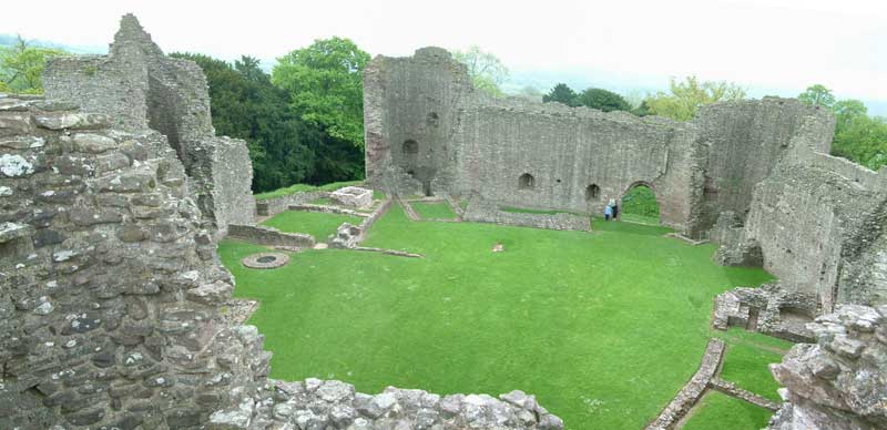 | Pictured left is the inner ward. remains of the well and foundations of the buildings such as the chapel, hall, and kitchen can be clearly seen |