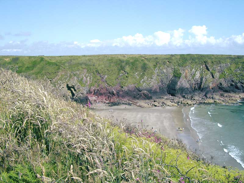 If you are using a car to visit St Davids in Pembroke, just before entering the main street, look for the car park sign on your left. You will also see a sign for Caerfai Bay. If you need the toilet, now is the time to go (theres one in the car park) as there were no toilets at Caefai the last time I came here,.The road to Caerfai is fairly narrow so take care, but its only a few minutes drive. The car park overlooks the bay so it is a pleasant stop for the flask and sandwiches! Caerfai is a popular bathing beach, the closest to St Davids. Although mostly rocks at high tide, it's sand as the tide drops. The beach is reached down a short but steep path. The beach is surrounded by cliffs of purple sandstone used to build St David's Cathedral. There are some nice rock pools for the children, and also caves to be explored but keep away from the cliffs as they are unstable!