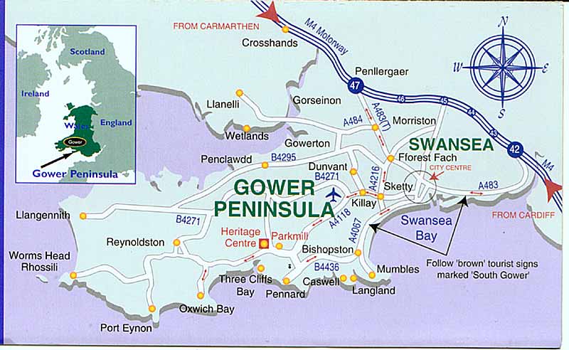 | Distances to the Gower From Miles KMs Approx Time Birmingham 152 247 2 3/4 hrs Cardiff 47 76 1 hr Dover 280 449 5 hrs Fishguard 61 94 2 hrs Folkestone 286 458 5 hrs Gatwick 226 364 3 1/2 hrs Harwich 292 468 5 1/2 hrs Heathrow 184 304 2 3/4 hrs London 200 320 3hrs Pembroke 61 98 1 1/4 hrs Plymouth 212 340 4 hrs Manchester 194 324 3 1/2 hrs From the East leave the M4 motorway at Jct 42 and follow brown tourist signs to South Gower and the A4067. From the West leave the M4 at Jct 47 and follow the A483 into Swansea and then follow the A4118 to Swansea airport. |