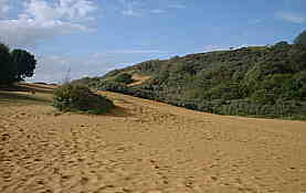 | Merthyr Mawr is a picturesque village which can be reached from the A48, (pop along to here on your way to Porthcawl) As you enter Merthyr Mawr turn left at the small village green, and after about 50yards you will find a small car park park near a small river bridge, cross over the bridge for a short walk to Ogmore castle. Afterwards, stroll around the village, return to the car ,back to the green, and turn left down the lane to the main car park, (you may have to pay a car park charge) and in front of you there are lots of sand dunes, in fact it is the largest sand dune system in Europe ! Scenes from the film "Lawrence of Arabia" were shot at Merthyr Mawr. Also you will find in the car park the ruins of the 15th century Candleston castle. If you are feeling energetic you can walk for miles over the dunes until you reach the sea ( great if you are training to join the foreign legion). |