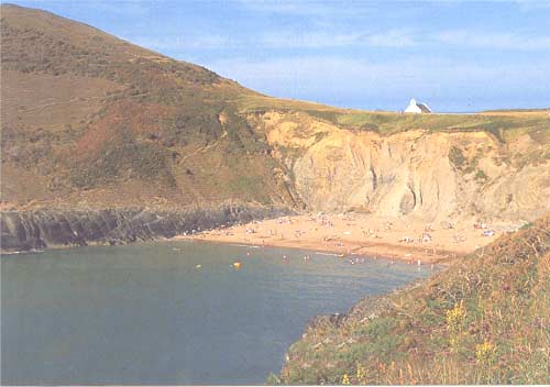 Mwnt (pronounced Moont) is a safe sandy cove with safe bathing and rock pools for the children. Unfortunately access to the beach is by steep steps and not really suitable for the disabled, but if you find the steps too difficult, there are some lovely views from the top.From here you may see the odd Bottle-nosed Dolphin. Overlooking the bay is the 15th century Mwnt Church which is open to visitors. There is a small cafe/shop open in the summer and ample car parking in the National Trust car park (ticket machine) There are toilets.