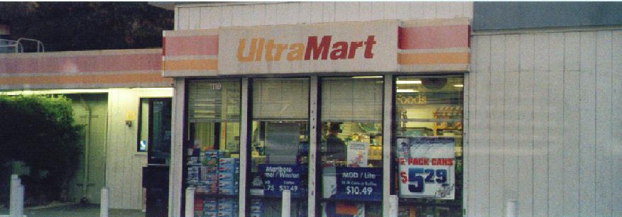 | 5. Auburn 10/2002, View of interior of convenience store. High Street. Tesoro promotion signage in the window. Currently unbranded (Auburn Food and Gas). The faded orange/red stripe has been painted white, and the �UltraMart� writing has been removed. Page 2 of Beacon Photos |