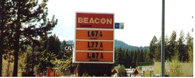 | 3. Beacon Kings Beach Sign 08/2002, Yet another corporate station. North Lake Blvd. North shore of Lake Tahoe. Branded Mobil in 12/2003, now owned by an independent dealer affiliated with Nella. Note the surrounding Safeway on the right. |