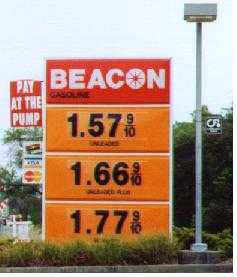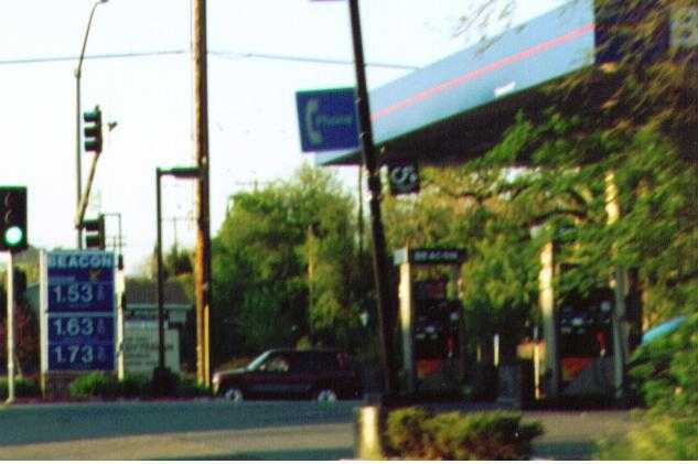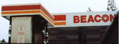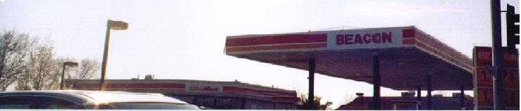 | 2. Beacon Loomis Sign and Canopy. Strange canopy covers half of the pumps but not all. 08/2002, Taylor Road. Large, older style orange sign, view from west. Currently branded USA. | ||||||||||||||||||