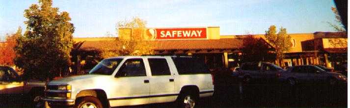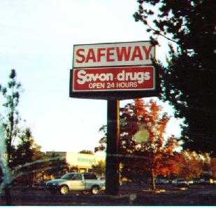 | 11/2001. Sign in front of store. The current Safeway sign was damaged my major winds in early 2003, and replaced with a newer, but very cheap, looking sign. When the next winds came through, the new sign was again destroyed and replaced with a similar cheap looking sign. | ||||||||||||||||||