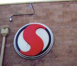 | 04/2002. Photo taken in back of store near loading dock area. This old sign remains, nothing like this out front. The sign is no longer lighted at night. | ||||||||||||||||||
