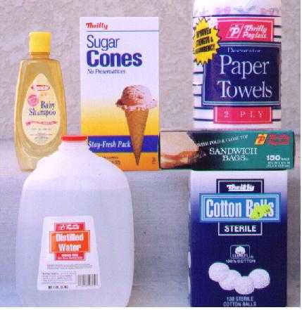 | A mix of items. Old bottle of baby shampoo. Modern looking box of ice cream cones like the ones still sold today. Box of cotton balls with old Thrifty logo but Payless style packaging design. | |||||||||||||||||||