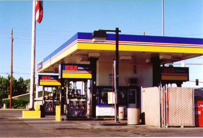 East Plumb Lane at Harvard Way; Reno, NV. September 2003. This station started as a Gull U-Serve in the late 1970's, then became USA, then in the late 1980's became an Arco for a very brief period of time, then became an Exxon, then became USA again in the mid 1990's. This station is now a Winners Corner Gasoline. Good shot of the side of this station. Notice that trash can with the USA logo toward the center of the photo. |
