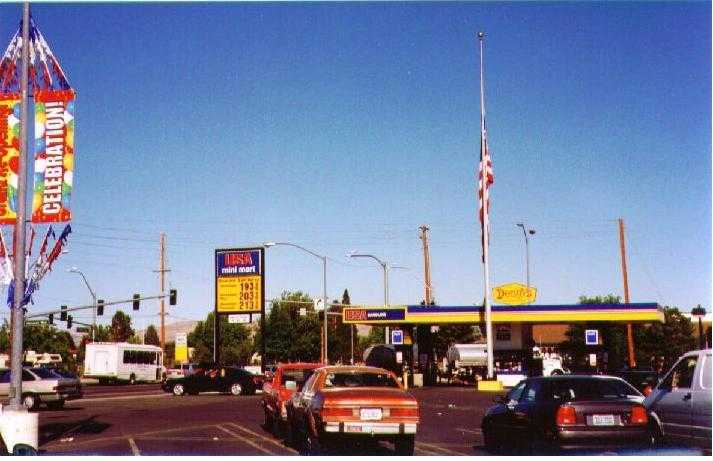 | September 2003. Plumb/Harvard, Reno. View of station with sign and canopy. The area between the pumps is where you pay. These guys take "mini" to a new extreme calling that a "mini mart." |