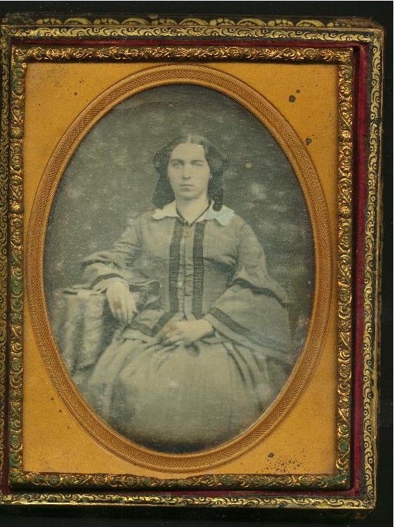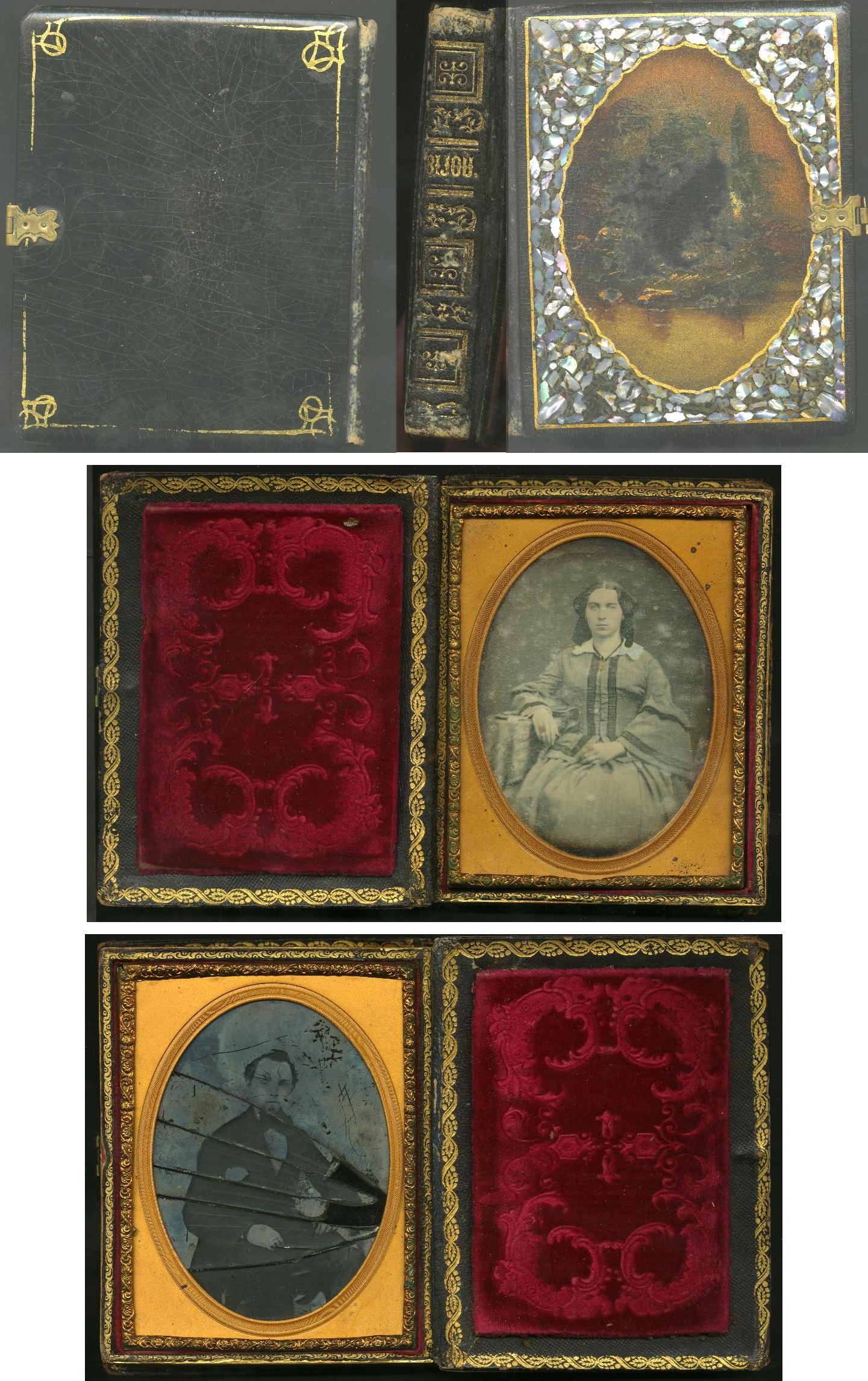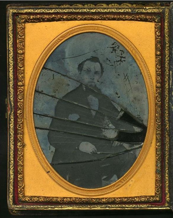 According to Kate Lund, an expert on historical photos, Ambrotypes were made from 1850 to 1855 only. The container is a photograph case, commonly used before the Civil War, and seen less but some used during and shortly after the war. The purpose of the case was to protect the portrait from light and, in the case of an Ambrotype, from breakage. It also allowed the portrait to be easily displayed and taken with you when you traveled. No negatives are used in the creation of Ambrotypes, therefore, each Ambrotype is unique.