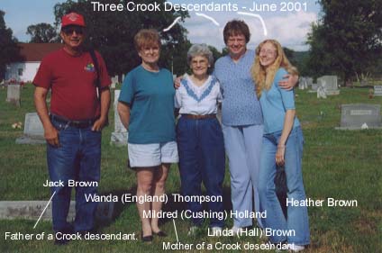 | Wanda England Thompson (granddaughter of Mountez Holland) (great-granddaughter of Mary Ellen Crook Blythe/Holland) (2nd great-granddaughter of Cincinnatus Berry Crook) Linda Hall Brown (granddaughter of Grover Cleveland Holland (great-granddaughter of Mary Ellen Crook Blythe/Holland) (2nd great-granddaughter of Cincinnatus Berry Crook Heather Brown (daughter of Linda Hall Brown) |