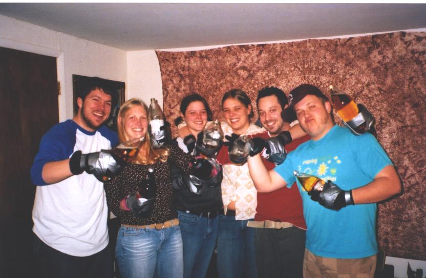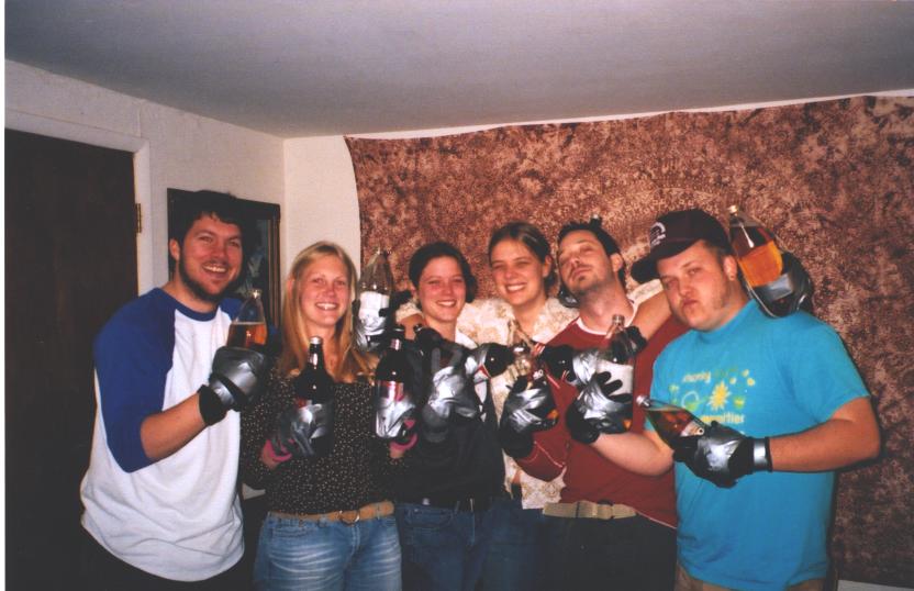 | This was a fun little game called "Edward 40-Hands" or "40-ounce wars" take your pick. Basically it involves the match of gloves, duck-tape, and lots of drinking. Here are the directions: 1. But two 40-ounces of malt liquor (or beer if you have a vagina). 2. Don a pair of gloves. 3. Tape the 40s to your hands. 4. Proceed to get shit faced. The only rules are that you cannot pee until you have drank both 40s. When I played, I went with the "drink them fast" strategy. I guess it worked well, I started last and finished second, after the person who started first. But it is true that shortly after finishing and taking my well earned piss, I did vomit. I encourage everyone to try this game, its fun. And I would also like to comment that I am proud of all the girls who participated in this game as they all finished. So if you try this and can't do it, then frankly you suck. -- Citizen D |
