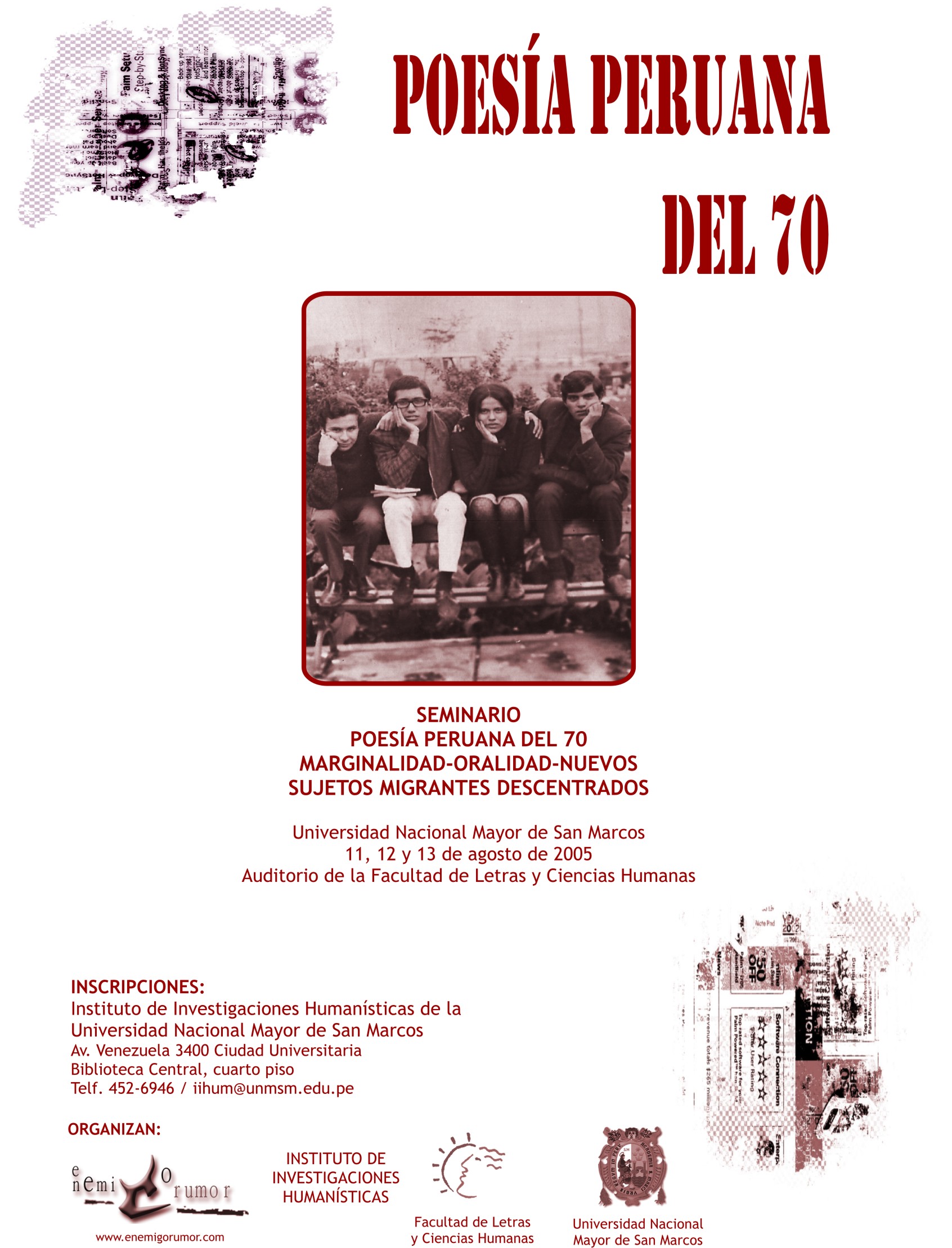 Reunimos algunas ponencias del Seminario Poesía Peruana del 70 realizado en la Universidad de San Marcos los días 11, 12 y 13 de agosto de 2005. Dicha actividad fue organizada por el Instituto de Investigaciones Humanísticas de la UNMSM y la revista virtual Enemigo rumor (ahora Sol negro). Muchas ponencias fue imposible recopilarlas debido a su carácter oral y otras han sido publicadas en otros espacios como: