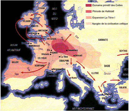 | Vers les ann�es 1000-750 avant J-C, les peuples proto-celtiques dominent la majeure partie du continent europ�en. En 700 avant J-C, les premiers Celtes s'�tablissent en Autriche et vers 600 avant J-C, ils commencent le commerce avec les M�diterran�ens. Vers 500 avant J-C, la civilisation celtique entre dans l'�re de la T�ne. Puis, vers 400 avant J-C, les Celtes envahissent l'Italie et s'installent en Gaule. En 390 avant J-C, des Celtes attaquent Rome. Ensuite, en 279 avant J-C, ils envahissent la Gr�ce et en 275, ils fondent la Galatie en Turquie septentrionale. Dans les ann�es 200 avant J-C, les Celtes �difient des � oppida � et se multiplient en Gaule et en Boh�me. |