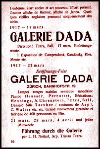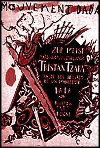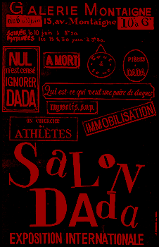 Dos de las manifestaciones dadaísticas más importantes y escandalosas datan de 1920. La primera tuvo lugar en la Maison de lOeuvre (donde estalló 25 años antes el escándalo Jarry con su obra Ubu Roi. El programa fue abundante y variado (teatro, comedias, La Primera Aventura Celeste del señor Antipyrine y un doble cuatrálago de Tzara, música, manifiestos... La decoracíón de todos estos números se compone de un transparente del que cuelga una rueda de bicicleta que distribuye las cuerdas que sujetan las pancartas. Una célebre cantante de conciertos interpreta melodías de Duparc. El público, furioso y enloquecido no puede hacer más que silbar, y dadá, sobreexcitado en extremo, responde con injurias cada vez más absurdas, cada vez más violentas, mientras que una hoja antidadá (NON), se lanza en la sala y los dadaístas se felicitan por el éxito. |