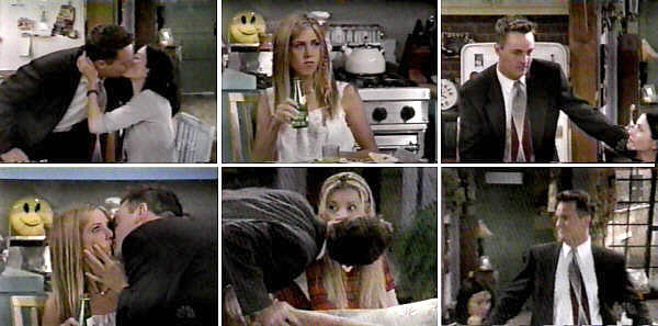 | 8 TOW all the Kissing After Chandler and Monica getting together in London, they sort of forgot that no one knew and he starting kissing Monica before he went to work. After they relized he had to kiss Rachel and Pheobe also so they wouldn't suspect anything |