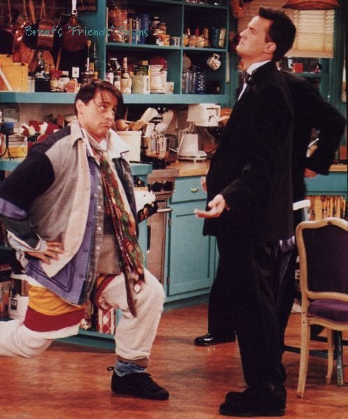 | 2 TOW No One's Ready Again this is an episode that the whole thing is really funny. Chandler went to the bathroom and Joey sat in his chair. He tries everything to get him up. Finally he goes and gets dressed and hides his underwear. Joey finally gets dressed. When they get into a fight about it and says he will do the opposite to him. He goes and puts on all of Chandler's clothes and does lunges. |