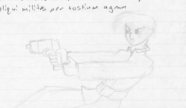 | I was drawing Ender just sitting there, but I drew his hair to swooshie so I made him doing one of those cool jumpy backy thingies and shooting some sort of futuristic gun *I can't draw guns and that makes me sad*. I know this never happens in the book, but it still looks cool ^^ |