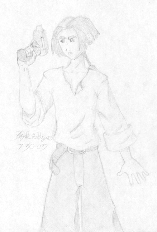 | Huzzah for more Jim! I'm considering making a shrine to my Triumvirate, but first I need to draw more pictures of them. Thus, I drew THIS picture! He's supposed to be sneaking around a corner, but I got lazy and didn't bother to draw the background. I'll do it later, honest! Well, that thing in his hand is supposed to be a laser gun, but I couldn't remember what they looked like in Treasure Planet so I tried drawing the one from Lilo and Stitch (which I only remembered slightly better than the Treasure Planet one) but it wound up looking like a hairdryer. I was very tempted to draw a power cord coming from it, lol. |