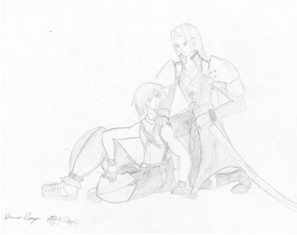 | RedRiku XV and I always wondered what would happen if Sora and Riku somehow went through the portal to the world where FF VII takes place. We decided that Cloud would begrudgingly "adopt" Sora in a big-brotherly fashion and slowly grow to like "the kid" *as he would probably call him*, and Sephiroth would take Riku under his wing and tend to call him "boy." We had a bunch of ideas for a fanfic going, like Cloud and Sora would be on a quest to find whatever evil is rising and Sephiroth and Riku would "understand" each other and the whole "being a puppet" thing. Anyway, the story didn't fly, but here's one of the drawings we did for it. RedRiku sketched the models but she didn't like how it came out. I, however, did and so I filled in the details. |