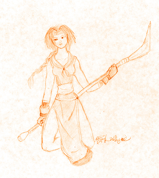 | Seung Mina is my absolute favorite female character of all time, right up there with Aeris from FFVII. Mina has been my super-mega-homie since I first played Soul Edge, way back when I was like six years old. She's exactly like me, she kicks the fattest ass, and she's muscular, the way a fighter should be, not like those scrawny-ass girls that are in most video games and anime. It's actually thanks to her that I got so good at using a staff in kung-fu, and why I like Aeris (because she looks like her and uses a big stick ^^). I used to try to draw her all the time but it never looked right. After I got better at drawing, though, I decided to take another stab at drawing my hero(ine) using a slightly more realistic style of drawing that I've been trying to tweak. I was going to draw her in a standing pose but I started too low on the paper and she ended up kneeling. I really like how this one came out ^^ |