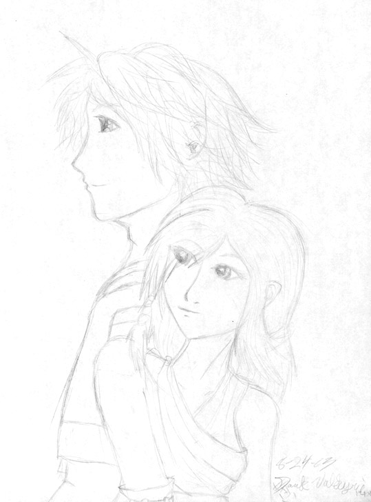 | FINALLY, I've drawn a decent picture of Tidus!! No, seriously, every time I try to draw this guy it turns out absolutely HORRIBLE! I was really iffy about doing this picture, but I really needed a Final Fantasy X art for my HTML binder (yep! Signed up for html class this year ^_^) so I had to draw something. I didn't want to do another Yuna art because she's the ONLY person from FFX that I ever draw, so I decided on this concept instead. But Yuna wound up in the picture anyway. But that's okay, because she looks really good. I didn't really intend for this picture to come out this style (more realistic than my usual stuff) but it works better than the more anime-esque style anyhow, so everything's fine and dandy. |