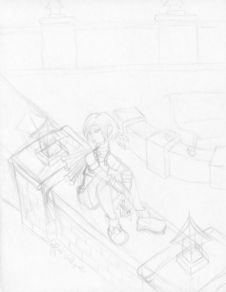 | Wow, what an inspired title, huh? Well, it says it all. Yuffie in Traverse Town. I was starting to work on a seriously detailed picture with background, but It just never got finished. And if you're wondering what's up with the bench, that was what I originally put there but then I realized that if this were to be an accurate depiction of Traverse Town that would have to be the fountain, so I started drawing that instead and didn't bother to erase the bench. I never got around to finishing the fountain because I couldn't find any screenshots/artwork of it and I knew that I wouldn't be able to turn on the game without having to beat it (because I LOVE IT TOO MUCH!!). So, yeah, the sad story behind this picture. |